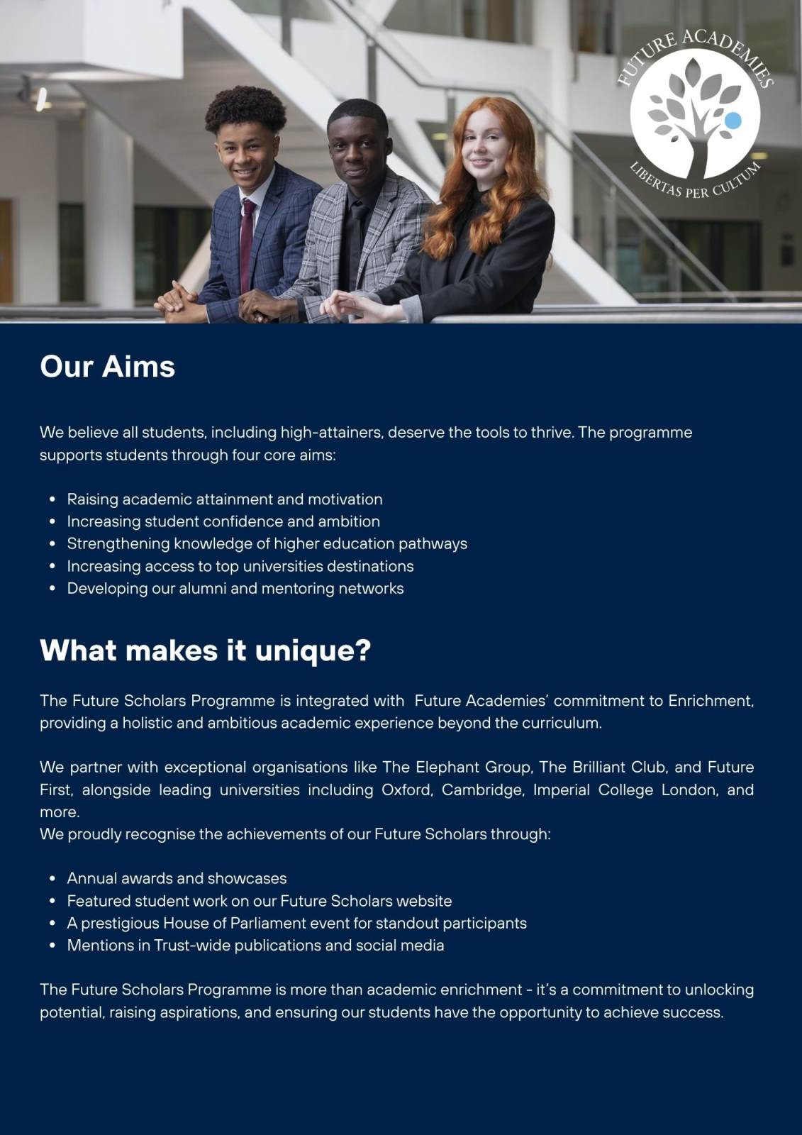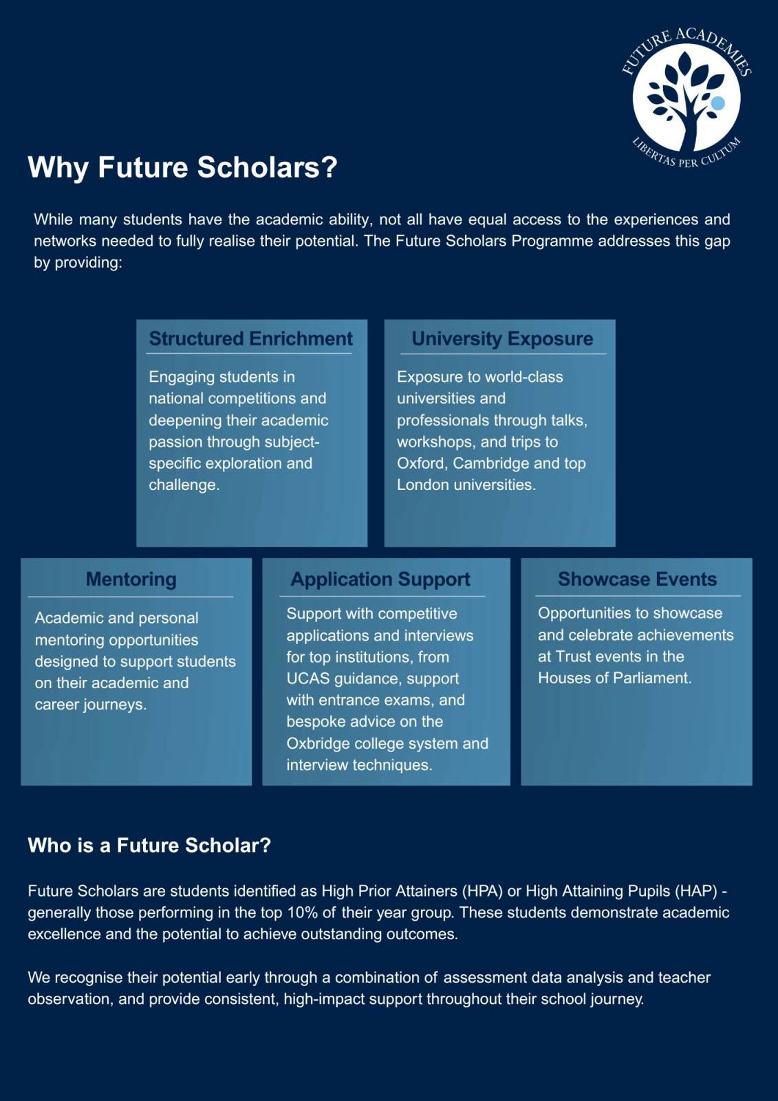 At Future Academies, we are proud to launch the Future Scholars Programme - our flagship academic enrichment initiative designed to support and inspire high-achieving students from Key Stage 2 through to Key Stage 5.